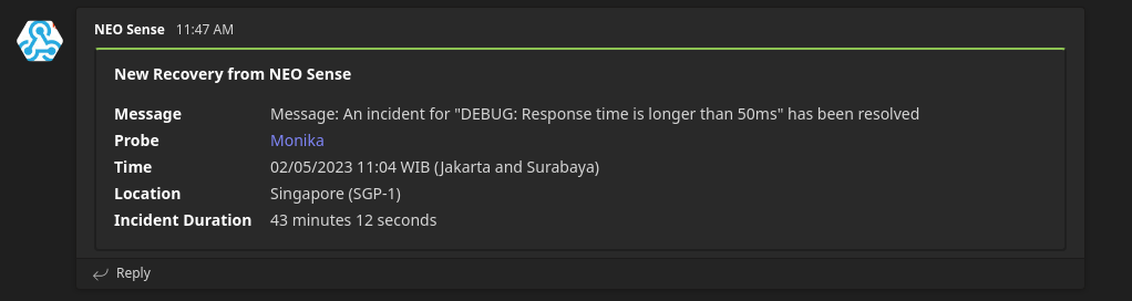 When there are any incidents/recoveries that happened to your probes, you will be notified through your Microsoft Teams channel.
