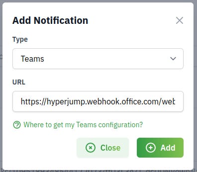 You will be redirected to the probe configuration page. Click the Notifications tab and you should see that the default notification channel is your registered email. To add Teams as your notification channel, click the Add Notification channel button. Then, select Microsoft Teams. Paste your copied webhook URL inside the URL input box and click Add.
