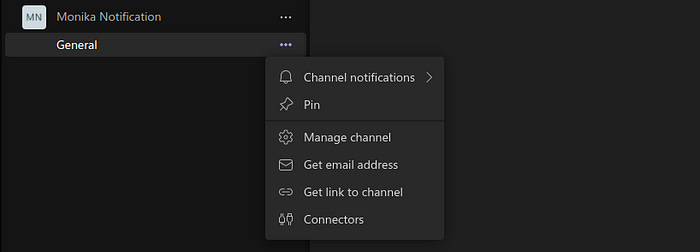 You need to have a team in Microsoft Teams. Download the Microsoft Teams app and create your user account. Then, follow the steps to create a new team. Now that we have our team ready, click the three dots on any channel in your team, and click Connectors.